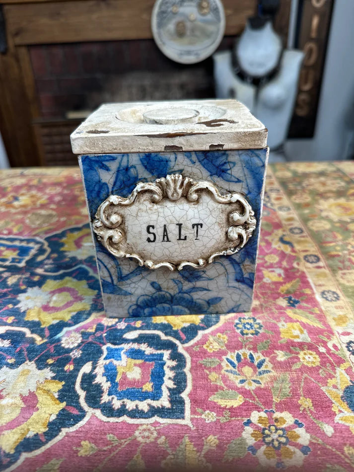 Crockery Treasures features four different patterns in various colors, each reminiscent of crockery ware and vintage tableware. Two of the patterns have a textured look, one is beige/tan, and the other is a sophisticated folk art design in blue.